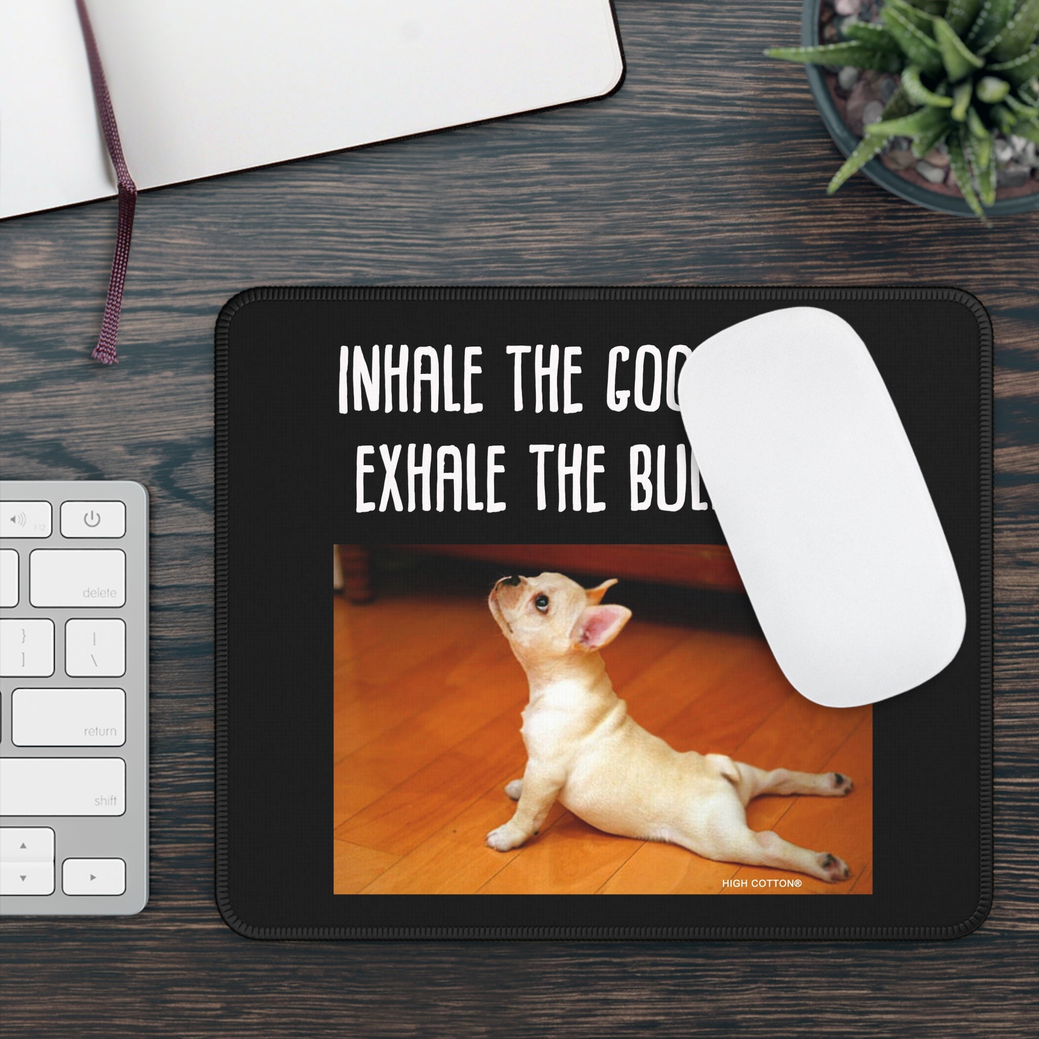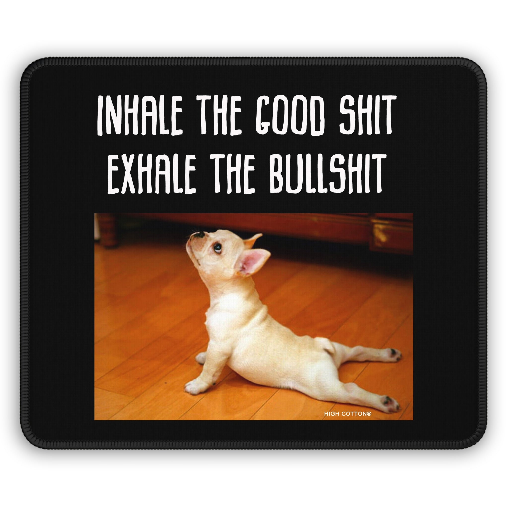 A compact, cheeky desk companion that brings a little calm and a lot of attitude to your workspace. This 9" x 7" neoprene mouse pad features a vivid, full-front print of a stretching French Bulldog puppy beneath bold, hand-lettered text that reads: “Inhale the good shit, exhale the bullshit.” The dense 3mm neoprene cushion and stitched edges give it a smooth, durable surface for accurate mouse movement, while the anti-slip rubber base keeps it firmly in place during focused sessions. Easy to wipe clean and bright in color, it slips into home offices, gaming desks, or study nooks that could use a smile and a reminder to breathe.